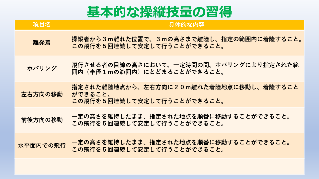 国土交通省航空局の標準マニュアルに記載されている包括申請ができる基準に最低10時間以上の飛行経験というものがあります。これは10時間飛ばせば良いというわけではなく航空局に指定された操縦技量を取得しなくてはなりません。どんな内容かといいますと